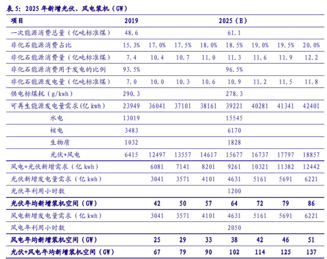 “十四五”非化石能源消費(fèi)目標(biāo)有望超預(yù)期,新能源裝機(jī)或再上一個(gè)臺(tái)階。由于新能 源行業(yè)降本速度迅速,且 2019 年國(guó)內(nèi)非化石能源消費(fèi)目標(biāo)已經(jīng)提前完成,我們預(yù)測(cè) 2025 年非化石能源消費(fèi)目標(biāo)有望超預(yù)期,非化石能源占一次能源消費(fèi)比重或超過(guò) 15%,達(dá)到 17.0%-20.0%的水平,對(duì)應(yīng)國(guó)內(nèi)光伏年均新增裝機(jī)空間為 42-86 GW,風(fēng)電年均新增裝機(jī)空 間為 25-51GW,合計(jì)年均新增裝機(jī)空間為 67-137 GW。