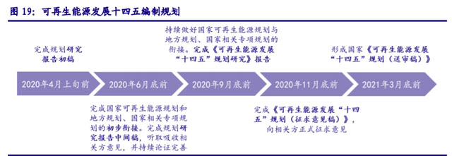 2020 年 4 月 9 日,《關(guān)于做好可再生能源發(fā)展“十四五”規(guī)劃編制工作有關(guān)事項(xiàng)的通 知》發(fā)布,提出“結(jié)合儲(chǔ)能、氫能等新技術(shù),提升可再生能源在區(qū)域能源供應(yīng)中的比重”, 規(guī)劃在 2020 年 9 月底前,完成《可再生能源發(fā)展“十四五”規(guī)劃研究》報(bào)告;2020 年11月底前,完成《可再生能源發(fā)展“十四五”規(guī)劃(征求意見(jiàn)稿)》。