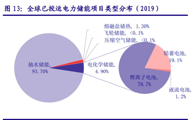 目前抽水儲(chǔ)能應(yīng)用最廣,電化學(xué)儲(chǔ)能占比較小。抽水儲(chǔ)能是指電力負(fù)荷低谷期利用過(guò) 剩電力將水從下池水庫(kù)抽到上池水庫(kù)時(shí)將電能轉(zhuǎn)化為重力勢(shì)能儲(chǔ)存起來(lái)的形式,綜合效率 在 70%到 85%之間,在全球目前已投運(yùn)的儲(chǔ)能項(xiàng)目中占比 92.6%,在我國(guó)占比 93.7%。電化 學(xué)儲(chǔ)能是指各種二次電池儲(chǔ)能,包括鉛酸電池、鋰電池等,在全球目前已投運(yùn)的儲(chǔ)能項(xiàng)目 中占比 5.2%,在我國(guó)占比 4.9%。