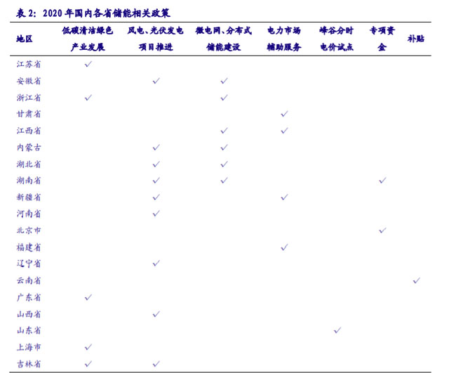 2020 年各省市出臺(tái)多項(xiàng)新能源配置儲(chǔ)能政策,推動(dòng)電儲(chǔ)能產(chǎn)業(yè)發(fā)展。以新疆維吾爾自 治區(qū)為例,新疆發(fā)改委在 2020 年 3 月 25 日和 5 月 6 日陸續(xù)出臺(tái)《新疆電網(wǎng)發(fā)電側(cè)儲(chǔ)能管 理辦法》、《關(guān)于做好 2020 年風(fēng)電、光伏發(fā)電項(xiàng)目建設(shè)有關(guān)工作的通知》政策,鼓勵(lì)發(fā)電、 售電、電力用戶、獨(dú)立輔助服務(wù)供應(yīng)商等投資建設(shè)電儲(chǔ)能設(shè)施,要求儲(chǔ)能容量在 10MW/20MWh 以上。要求新能源企業(yè)參與電力市場(chǎng)化交易和儲(chǔ)能設(shè)施建設(shè),繼續(xù)推進(jìn)南疆光伏儲(chǔ)能等集 中式儲(chǔ)能試點(diǎn)項(xiàng)目的建設(shè)。除了新疆,其它各省市也紛紛出臺(tái)相關(guān)政策,推動(dòng)儲(chǔ)能產(chǎn)業(yè)發(fā) 展。