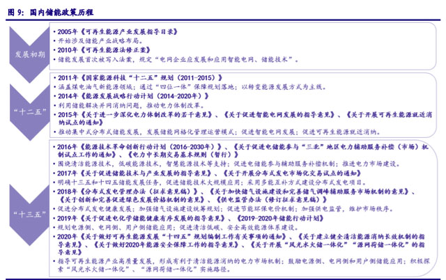 我國(guó)國(guó)家層面政策推動(dòng)儲(chǔ)能技術(shù)從研發(fā)示范向大規(guī)模應(yīng)用發(fā)展轉(zhuǎn)變。我國(guó)在儲(chǔ)能產(chǎn)業(yè) 的戰(zhàn)略布局開(kāi)始于 2005 年出臺(tái)的《可再生能源發(fā)展指導(dǎo)目錄》。2010 年,儲(chǔ)能行業(yè)發(fā)展 首次被寫(xiě)進(jìn)法案,《可再生能源法修正案》第十四條中規(guī)定“電網(wǎng)企業(yè)應(yīng)發(fā)展和應(yīng)用智能 電網(wǎng)、儲(chǔ)能技術(shù)”,在此法案指引下各地開(kāi)始制定儲(chǔ)能相關(guān)政策。2011 年,儲(chǔ)能被寫(xiě)入“十 二五”規(guī)劃綱要,《國(guó)家能源科技“十二五”規(guī)劃(2011-2015)》明確儲(chǔ)能研究方向。2014 年,《能源發(fā)展戰(zhàn)略行動(dòng)計(jì)劃(2014-2020 年)》首次提出利用儲(chǔ)能去解決可再生能源的 并網(wǎng)消納問(wèn)題。2016 年,《能源技術(shù)革命創(chuàng)新行動(dòng)計(jì)劃(2016-2030 年)》成為電儲(chǔ)能技 術(shù)發(fā)展的重要指導(dǎo)文件。2017 年 10 月 11 日,我國(guó)大規(guī)模儲(chǔ)能技術(shù)及應(yīng)用發(fā)展的首個(gè)指導(dǎo) 性政策《關(guān)于促進(jìn)儲(chǔ)能產(chǎn)業(yè)與技術(shù)發(fā)展的指導(dǎo)意見(jiàn)》正式發(fā)布,明確“十三五”和“十四 五”時(shí)期儲(chǔ)能發(fā)展任務(wù)。2019 年 6 月,《2019-2020 年儲(chǔ)能行動(dòng)計(jì)劃》進(jìn)一步推進(jìn)“十三 五”期間儲(chǔ)能由研發(fā)示范向商業(yè)化初期過(guò)渡,同時(shí)為“十四五”期間儲(chǔ)能由商業(yè)化初期向 規(guī)?;l(fā)展轉(zhuǎn)變奠定基礎(chǔ)。