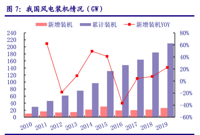 風(fēng)電:我國(guó)已經(jīng)成為全球最大風(fēng)電市場(chǎng),即將邁進(jìn)平價(jià)階段。根據(jù) GWEA,我國(guó)風(fēng)電累 計(jì)裝機(jī)容量占全球比重從 2000 年的 2.0%增長(zhǎng)至 2018 年的 35.4%。根據(jù)中電聯(lián),2019 年我 國(guó)風(fēng)電新增裝機(jī)達(dá)到 25.7GW(+22.6%),累計(jì)容量達(dá)到 210 GW,已經(jīng)成為全球最大風(fēng)電市 場(chǎng)。伴隨著行業(yè)的快速發(fā)展,風(fēng)電行業(yè)的補(bǔ)貼逐漸退坡,近年來(lái)國(guó)家多次下調(diào)風(fēng)電上網(wǎng)標(biāo) 桿電價(jià)。根據(jù)發(fā)改委規(guī)定,對(duì)于“2018 年底之前核準(zhǔn)、2020 年底前未完成并網(wǎng)”,“2019 年至 2020 年底前核準(zhǔn)的、2021 年底前未完成并網(wǎng)”的陸風(fēng)項(xiàng)目,國(guó)家將不再補(bǔ)貼;2021 年 1 月 1 日起新核準(zhǔn)的陸風(fēng)項(xiàng)目全面實(shí)現(xiàn)平價(jià)上網(wǎng),行業(yè)即將邁進(jìn)平價(jià)階段。