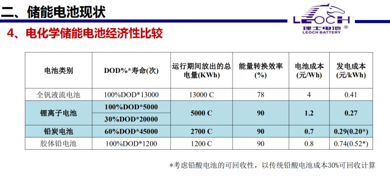 這是從經(jīng)濟(jì)性上比較的,發(fā)電成本只是純電池,不包括系統(tǒng)。如果要算系統(tǒng),按最后的成本可能要乘2-3,也不包括充電。目前看來鋰離子電池和鉛炭電池有優(yōu)勢。鉛炭電池雖然慢慢被取代,但到目前為止還是唯一一個能夠循環(huán)利用的,其他的體系的電池還都做不到,所以它還仍然有生命力。