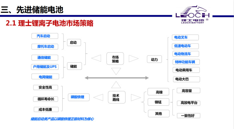 二、鋰電池策略。我們主要是做磷酸鐵鋰電池,鋰電池應(yīng)用于通信儲能、電網(wǎng)儲能,低速電車車,再就是摩托車、汽車啟動。我們生產(chǎn)設(shè)備也兼容三元鋰和錳酸鋰。