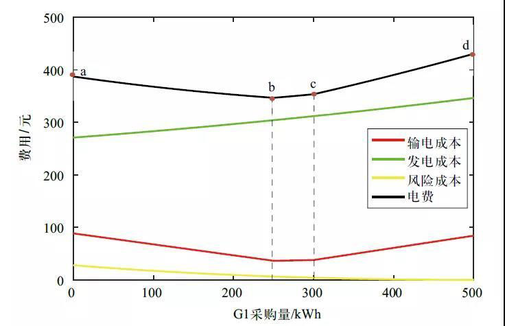 在霍特林模型下綜合考慮發(fā)電成本、風險成本和輸電成本,交易方案產生的實際電費如圖4所示。隨著用戶在G1處所購電量增加,風險成本逐步降低,總電費呈現(xiàn)先降低后升高的趨勢。相較于發(fā)電成本,輸電成本占比小,且不僅取決于交易雙方,也受實際電網線路的制約,仿真難度相對較大,所以在電力交易中經常被簡化忽略。但若只考慮發(fā)電成本,會從G2購買全部電力,雖然發(fā)電成本最低僅271元,但電能傳輸引起的輸電成本較高,增加了總費用。相比之下,雖然方案b的發(fā)電成本略高為305元,但其極大節(jié)約了輸電成本,最終降低了總費用至347元。因此,電力交易中對輸電成本的考量很有必要。