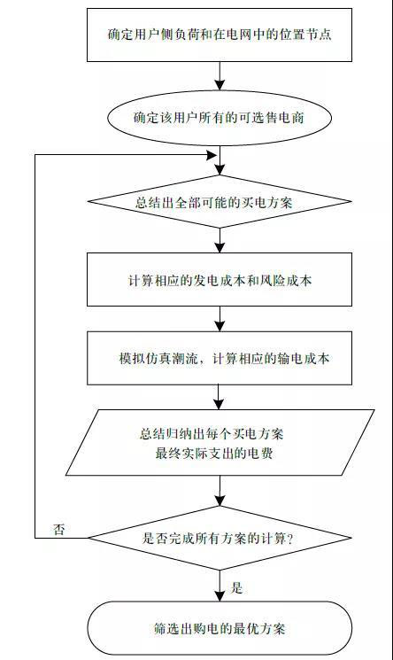 在交易開始前,先確定用戶的負荷需求及其在電網中的具體位置,根據位置確定潛在可選擇的發(fā)電商,推導出可能的交易策略。為了篩選出經濟最佳方案,需要分別模擬每種策略的發(fā)電成本、風險成本和輸電成本。發(fā)電成本通過綜合所選發(fā)電商的發(fā)電成本和相應采購量計算。風險成本需要確定所選發(fā)電商是否存在可再生能源,并根據其相應的采購量計算。輸電成本需先仿真電路潮流,在相應線路潮流的基礎上綜合整合而得。