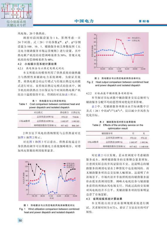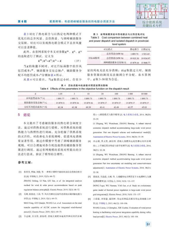 結(jié)論:本文提出了考慮輔助服務(wù)的熱電聯(lián)合調(diào)度方法,通過對供熱系統(tǒng)進(jìn)行建模,對供熱系統(tǒng)的儲熱能力與熱慣性進(jìn)行刻畫,充分挖掘了供熱系統(tǒng)的靈活性,對改善電力系統(tǒng)調(diào)峰、促進(jìn)風(fēng)電消納有顯著作用。通過在模型中考慮了調(diào)峰輔助服務(wù)規(guī)則,可以合理地對各臺機組提供的輔助服務(wù)資源進(jìn)行調(diào)用。通過省網(wǎng)規(guī)模的系統(tǒng)對所提出的方法進(jìn)行仿真,驗證了模型的合理性。
