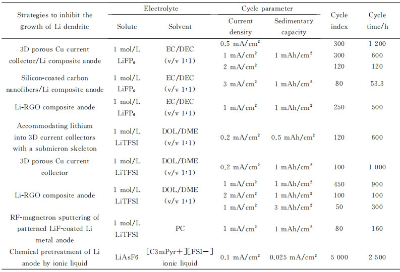 表1 近幾年鋰金屬負(fù)極材料的循環(huán)性能對比
