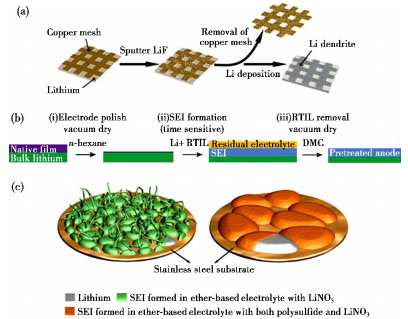 圖3 各種人工SEI膜:(a)氟化鋰作為人工SEI膜改性鋰金屬負(fù)極;(b)利用離子液體電解質(zhì)進(jìn)行化學(xué)預(yù)處理制備人工SEI膜的過程;(c)加入添加劑改性電解液的鋰沉積形貌示意圖