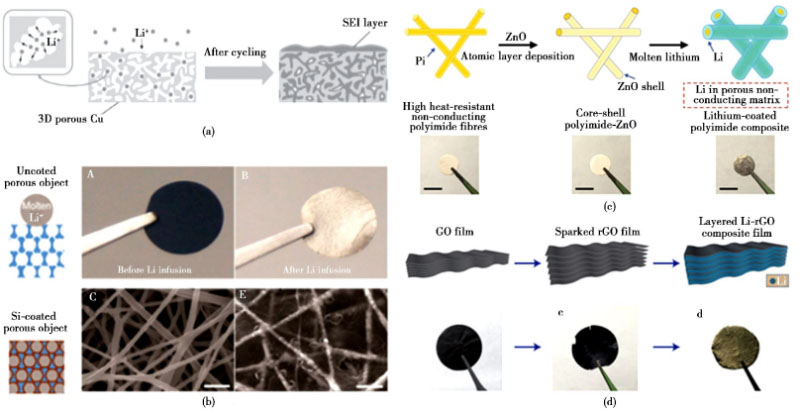 圖2 不同穩(wěn)定Li沉積主體的策略:(a)去合金化制備三維多孔鋰負(fù)極集流體;(b)硅包覆的碳納米纖維/鋰復(fù)合負(fù)極; (c)氧化鋅包覆的碳納米纖維/鋰復(fù)合負(fù)極;(d)分層還原氧化石墨烯/鋰復(fù)合負(fù)極
