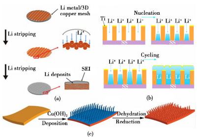 圖1 三種增加鋰的表面積來抑制枝晶生長的策略:(a)三維多孔銅網(wǎng)/鋰復(fù)合負(fù)極;(b)具有垂直納米通道的聚酰亞胺改性鋰沉積;(c)可容納鋰的亞微米結(jié)構(gòu)銅集流體