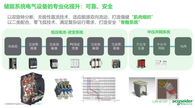 在整個(gè)鏈路上,幾個(gè)環(huán)節(jié)都比較重要。施耐德電氣有很多關(guān)鍵性的技術(shù),保障了設(shè)備的可靠性、以及對故障響應(yīng)的 及時(shí)性。例如斷路器以雙旋轉(zhuǎn)分?jǐn)唷o極性直流技術(shù),適應(yīng)能源雙向流動(dòng)裝備。在儲(chǔ)能電站范圍內(nèi),檢修人員操作設(shè)備時(shí),斷路器里如果噴出來帶電氣體,很容易造成人員傷害。從元件的角度,施耐德電氣的框架短路器具有零飛弧技術(shù),實(shí)現(xiàn)了元件本身的安全性,實(shí)現(xiàn)對運(yùn)維人員的保護(hù)。
