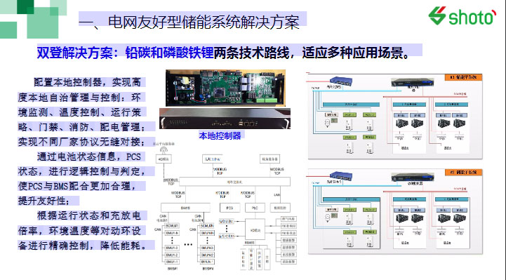 我們的解決方案是儲能和智能控制、電力電子和新能源技術(shù)進行深度融合,整個系統(tǒng)基礎(chǔ)上,能夠適應(yīng)4G到5G的升級,同時擴容改造和新站建設(shè),可以節(jié)省建設(shè)和運維成本。我們推出智能化混電控制器,相當(dāng)于智能大腦,統(tǒng)一采集,所有數(shù)據(jù)做到數(shù)據(jù)整理和清洗,統(tǒng)一的平臺實現(xiàn)整個能源的控制和調(diào)度,站點實現(xiàn)遠(yuǎn)程和本地化管理。左邊是和光伏、電網(wǎng)之間做了運行策略的優(yōu)化,達到系統(tǒng)運營成本和建設(shè)成本最低的目標(biāo)。