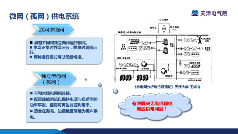 我們跟天津大學(xué)的王教授有非常深度的合作,對于電網(wǎng)的分類,一般就是聯(lián)網(wǎng)型或者是獨立型。聯(lián)網(wǎng)型就是跟大電網(wǎng)有PCC節(jié)點,但是也具有獨立運行的能力。在電網(wǎng)建成的時候,并網(wǎng)進(jìn)行,離網(wǎng)的時候快速的切換。我們更多的關(guān)注是獨立型的微網(wǎng),有別于常規(guī)電網(wǎng),獨立型微電網(wǎng)相對比較弱,需要配置儲能作為符合和電源之間的功率平衡,提高新能源的滲透率。這是一種有效解決無電或者是弱電的技術(shù)綜合性的解決方案。