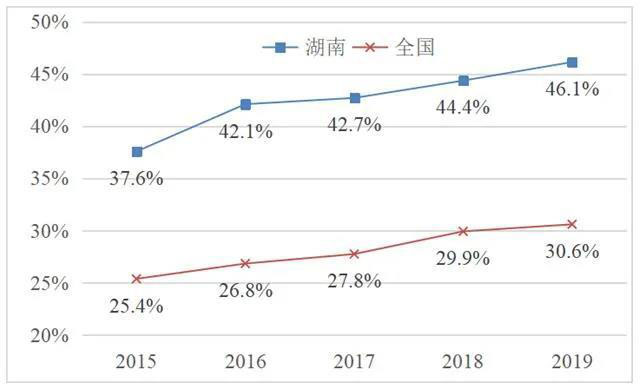 圖2 三產(chǎn)和生活的用電占比(湖南和全國)