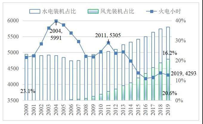 風(fēng)電和光伏波動(dòng)性電源,靠天吃飯,無法提供穩(wěn)定出力,甚至可能極寒無光、極熱無風(fēng)。2006年風(fēng)電光伏裝機(jī)容量的占比為0.3%,2019年提高至20.6%。隨著風(fēng)電、光伏、徑流式水電裝機(jī)占比的迅速提高,煤電在提供電量的同時(shí),需頻繁調(diào)峰,以保證風(fēng)光的優(yōu)先發(fā)電,利用小時(shí)下降。
