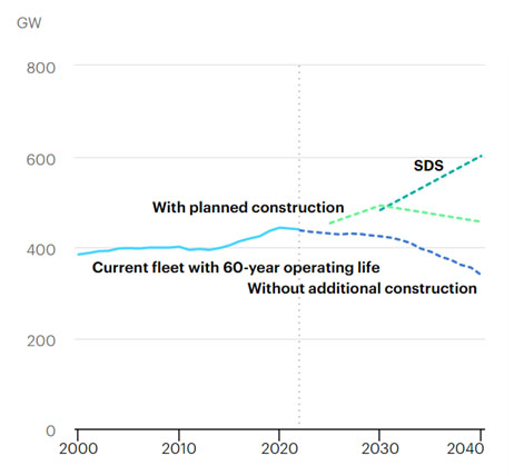 按照目前計(jì)劃的建設(shè)趨勢(shì),全球核電裝機(jī)將在2030年后呈現(xiàn)下降態(tài)勢(shì),2040年的裝機(jī)僅為456吉瓦,遠(yuǎn)低于IEA的SDS設(shè)定目標(biāo)601吉瓦。IEA指出,2020~2040年,核電裝機(jī)年均增加15吉瓦,才能達(dá)到SDS水平。
