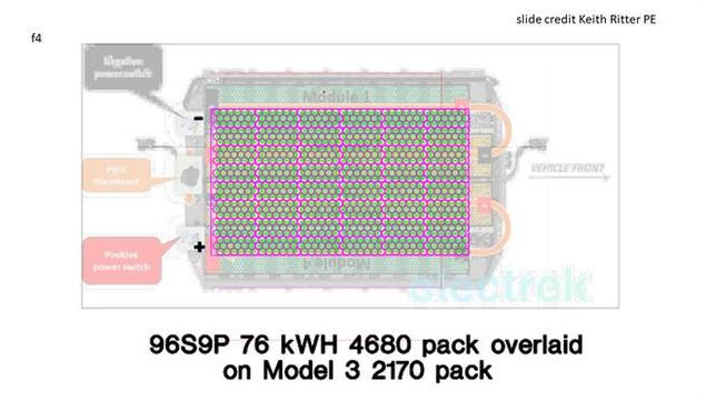76 kWh 4680電池組尺寸(估算)同比例對(duì)照Model 3現(xiàn)有2170電池組
