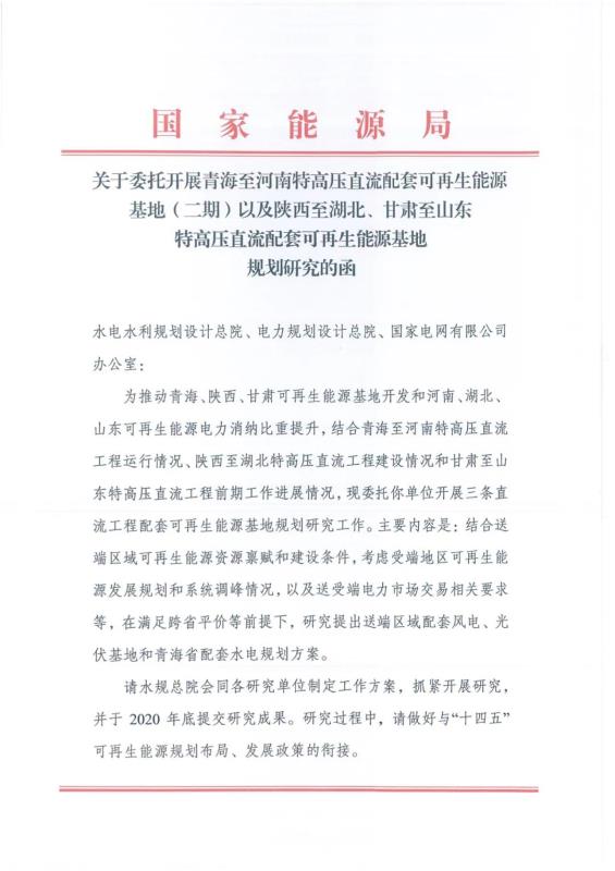 近日,光伏們獲悉,國(guó)家能源局發(fā)函委托水電總院、電規(guī)總院以及國(guó)家電網(wǎng)對(duì)青海至河南特高壓直流配套可再生能源基地(二期)、陜西至湖北、甘肅至山東特高壓直流配套可再生能源基地進(jìn)行規(guī)劃研究。根據(jù)文件,三大基地規(guī)劃方案將于2020年底提交。