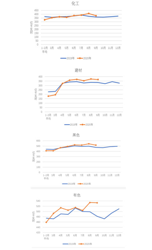 9月份,化工行業(yè)用電量381億千瓦時,同比增長5.2%,增速比上年同期提高6.1個百分點;建材行業(yè)用電量368億千瓦時,同比增長10.3%,增速比上年同期提高5.0個百分點;黑色金屬冶煉行業(yè)用電量518億千瓦時,同比增長8.9%,增速比上年同期提高6.2個百分點;有色金屬冶煉行業(yè)用電量533億千瓦時,同比增長10.3%,增速比上年同期提高15.1個百分點。