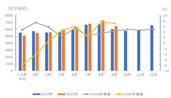 1-9月,全國全社會用電量54134億千瓦時,同比增長1.3%,其中,9月份全國全社會用電量6454億千瓦時,同比增長7.2%。