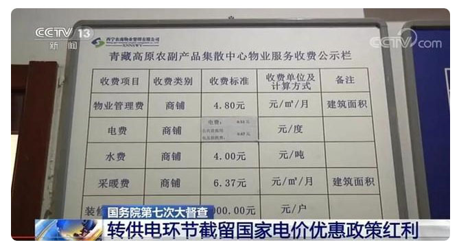 在西寧市青藏高原農副產品集散中心,督查組看到物業(yè)服務收費公示欄顯示,商鋪繳納的電費標準是每度1.2元,由0.53元的電度電價和0.67元的公共設施用電及損耗費兩部分組成。而《中華人民共和國電力法》規(guī)定,任何單位和個人禁止在電費中加收其他費用。督查組調查發(fā)現,該集散中心從電網企業(yè)的最新購電均價僅為0.48元/度,而供給商戶卻收取1.2元/度,加價幅度達到了150%。督查組走訪了部分商戶,均反映集散中心一直按每度1.2元的標準收電費,自2018年以來從來沒有降過價,沒有將國家連續(xù)3年實施的降電價政策紅利及時足額傳導下去。
