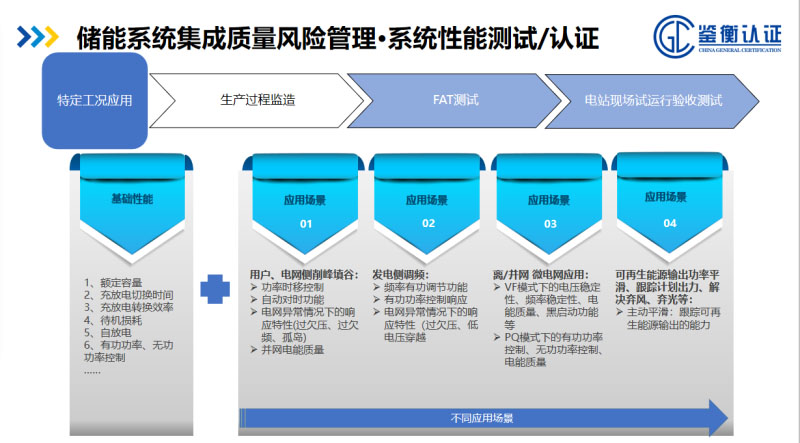 然后是產(chǎn)品型式試驗,把儲能系統(tǒng)作為一個實實在在的產(chǎn)品,一定要進行成品檢測的,我們關(guān)注安全性能以及功能的檢查,然后就是大家所關(guān)注的,作為一個儲能產(chǎn)品,應(yīng)該關(guān)注它的基本電性能、轉(zhuǎn)換功率這些指標(biāo),電磁抗擾的能力和發(fā)射水平。