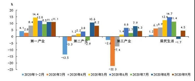 居民生活用電量增速首次超過上年同期水平。前三季度,居民生活用電量6632億千瓦時,同比增長5.2%,增速較上年同期上升0.1個百分點。其中,城鎮(zhèn)居民、農(nóng)村居民生活用電量增速分別為3.6%、7.2%,分別較上年同期變化-1.2、1.8個百分點。9月份,居民生活用電量887億千瓦時,同比增長4.5%。