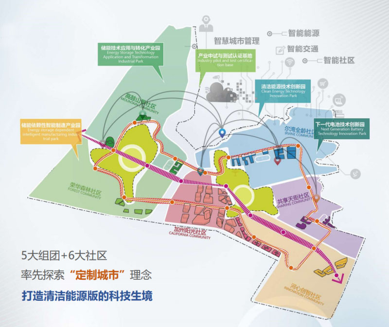 依托四大產(chǎn)業(yè)圈層,針對不同城市空間需求,中糧·眉山加州智慧城規(guī)劃了功能高度定制的五大類城市功能組團,分別是:儲能技術(shù)應(yīng)用與轉(zhuǎn)化產(chǎn)業(yè)園、清潔能源技術(shù)創(chuàng)新園、產(chǎn)品中試與測試認證基地、下一代電池技術(shù)創(chuàng)新園、儲能依賴型智能制造產(chǎn)業(yè)園。結(jié)合五大功能組團,布局六大能量社區(qū),組團內(nèi)產(chǎn)城融合,組合間協(xié)同高效。