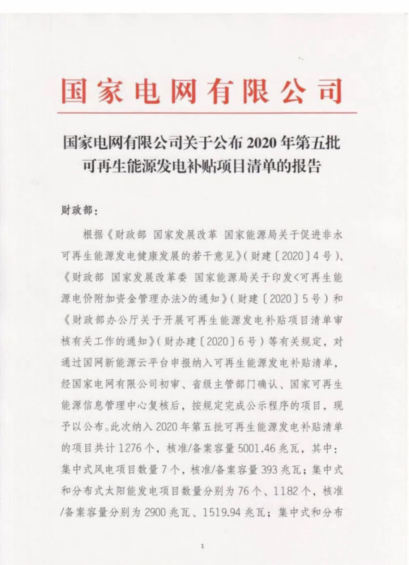關(guān)于公布2020年第五批可再生能源發(fā)電