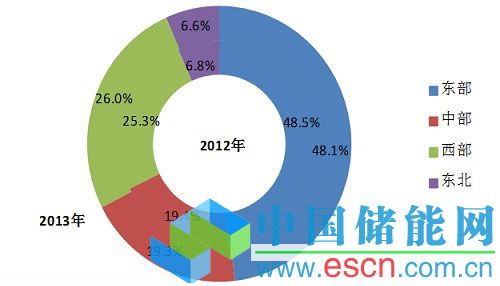 圖2 2012、2013年全國(guó)分地區(qū)電力消費(fèi)結(jié)構(gòu)圖