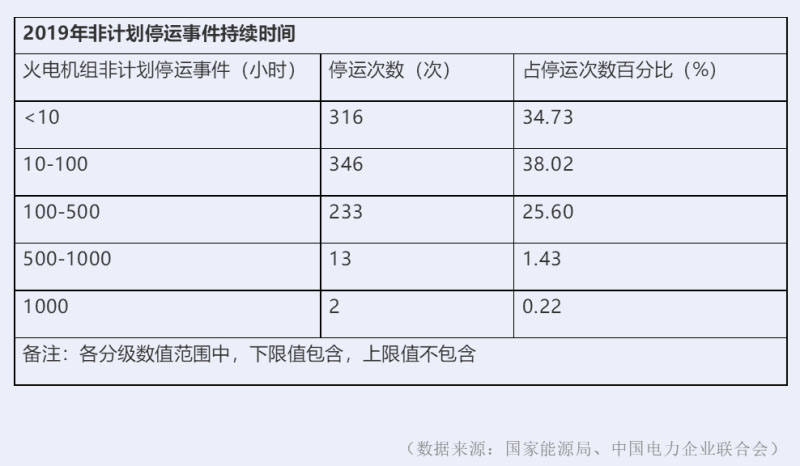 2019年,按照我國燃煤機組非計劃停運事件持續(xù)時間長短分類,停運次數(shù)最多的是10-100小時區(qū)間的非計劃停運事件,并且大部分是強迫停運事件,占燃煤機組非計劃停運次數(shù)的38.02%;其次是小于10小時的區(qū)間,占燃煤機組總非停次數(shù)的34.73%;超1000小時的有2次。