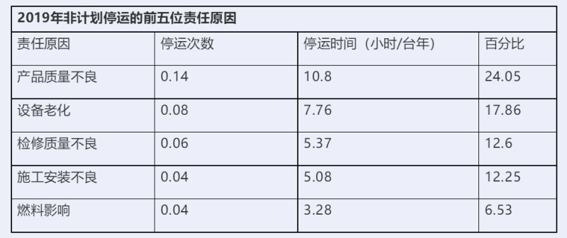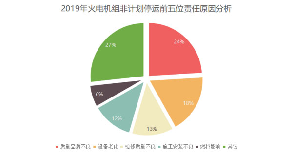 按照造成發(fā)電機組非計劃停運的責(zé)任原因分析,產(chǎn)品質(zhì)量不良是第一位,臺年平均為0.14次、10.8小時。前五位主要責(zé)任原因占全部燃煤機組非計劃停運總時間的76.62%。