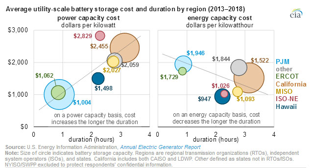 電池儲能系統(tǒng)的部署成本因地區(qū)和應(yīng)用場景而異。美國的電力系統(tǒng)主要由獨立系統(tǒng)運營商(ISO)和區(qū)域輸電組織(RTO)管理和運行。為了了解電池儲能系統(tǒng)成本如何根據(jù)部署的位置而發(fā)生變化,美國能源信息管理局(EIA)將加利福尼亞州的獨立系統(tǒng)運營商(ISO)和區(qū)域輸電組織(RTO)匯總在一起,以避免在電池儲能系統(tǒng)部署較少的地區(qū)披露受訪者的機(jī)密信息。在區(qū)域市場層面,2013年至2018年的電網(wǎng)規(guī)模電池儲能系統(tǒng)的平均成本各不相同,例如PJM互聯(lián)公司的成本為1946美元/ kWh,而夏威夷電力公司的成本為947美元/ kWh。