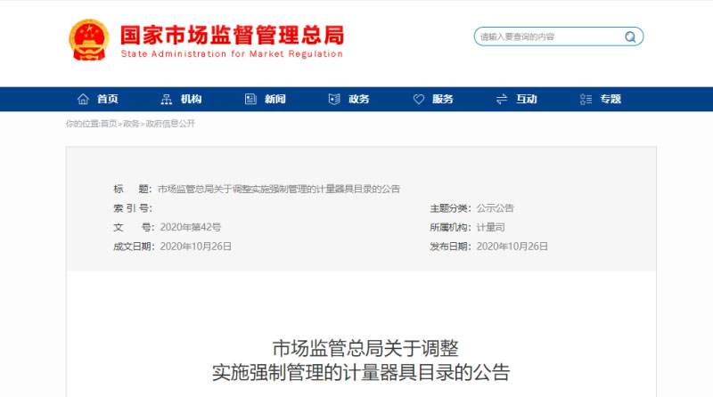 國家市場監(jiān)管總局關(guān)于調(diào)整實施強制管理的計量器具目錄的公告