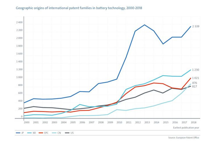 歐洲專利局與國際能源署近日發(fā)布的聯(lián)合報告顯示,2018年,日本提交的與電池相關的發(fā)明專利申請數(shù)量達到2339例,為全球最多,是第二名韓國1230例的約兩倍。