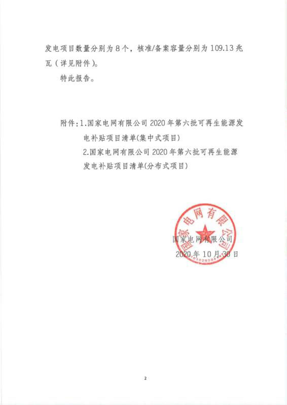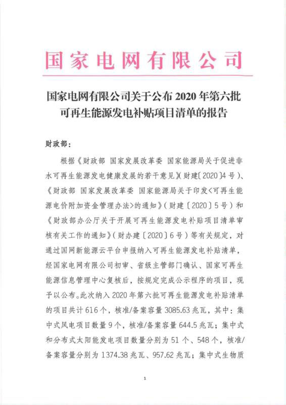 關(guān)于公布2020年第六批可再生能源發(fā)電