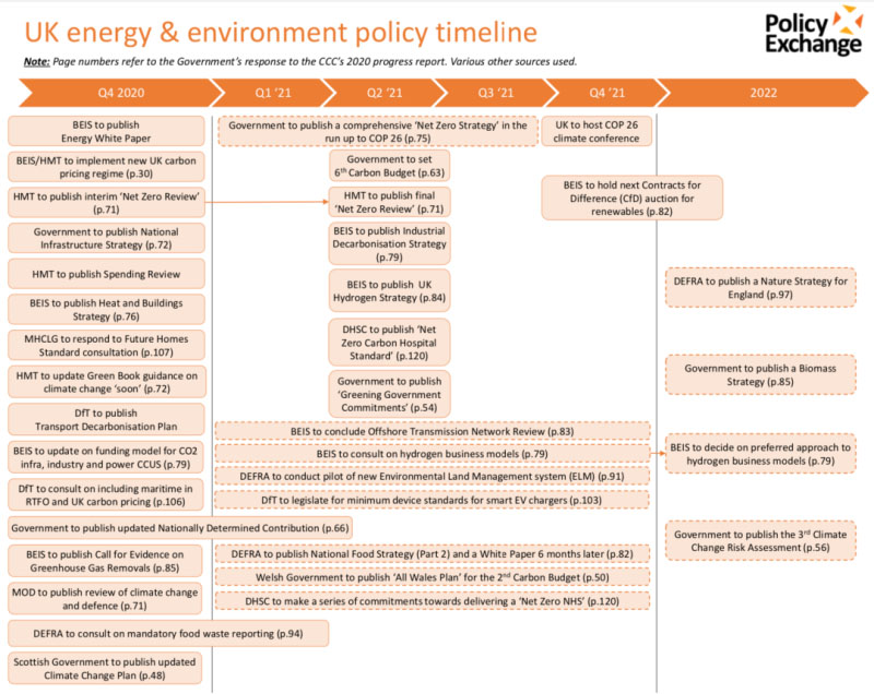 中國儲能網(wǎng)訊:根據(jù)PolicyExchange網(wǎng)站的匯總,未來12個月對于英國的能源和環(huán)境政策極為重要。如下圖所示,一個政府準備在2021年11月在格拉斯哥舉行COP26氣候會議前后出臺多個能源環(huán)境相關(guān)的政策文件。