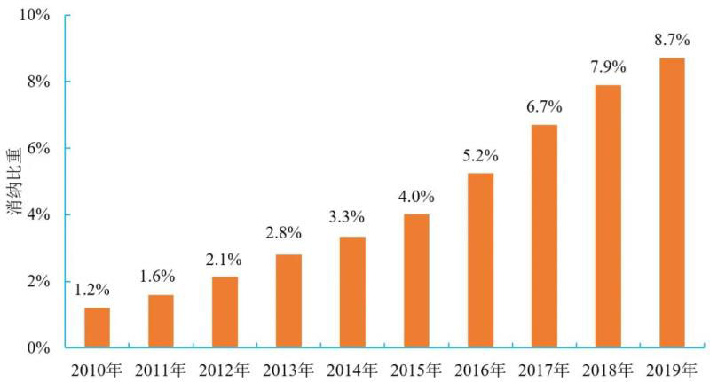 我國風光發(fā)電發(fā)展領跑全球。2019年,全國風光發(fā)電裝機4.15億kW,同比增長15.6%,占發(fā)電總裝機比重由2010年的3.2%提升至20.6%;發(fā)電量6300億kW·h,同比增長15.9%,發(fā)電量占總發(fā)電量比重由2010年的1.2%提升至8.6%。風光發(fā)電消納比重(消納電量/全社會用電量)呈逐年上升趨勢,2019年,風光電力消納比重為8.7%,超過世界平均水平。2010-2019年我國風光電力消納比重變化趨勢如圖1。