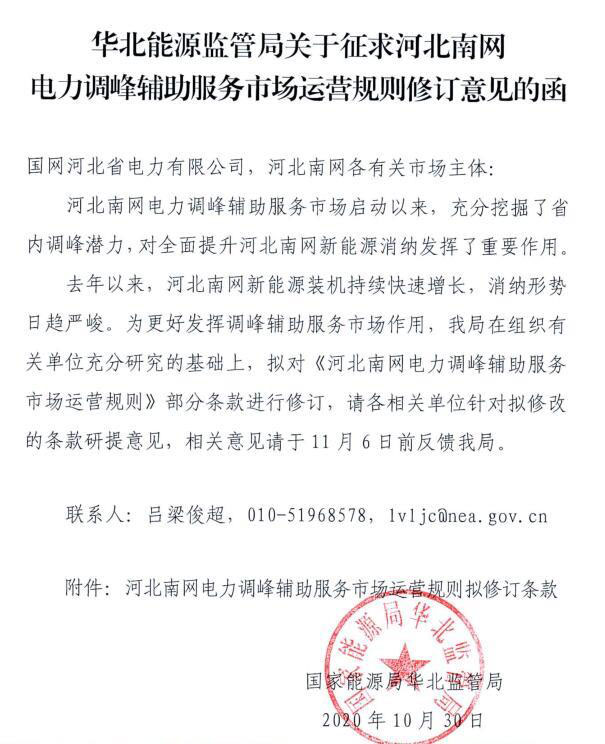 中國(guó)儲(chǔ)能網(wǎng)訊:11月2日,華北能源監(jiān)管局印發(fā)關(guān)于征求河北南網(wǎng)電力調(diào)峰輔助服務(wù)市場(chǎng)運(yùn)營(yíng)規(guī)則修訂意見(jiàn)的函,就擬修改條款征求意見(jiàn)。詳情如下: