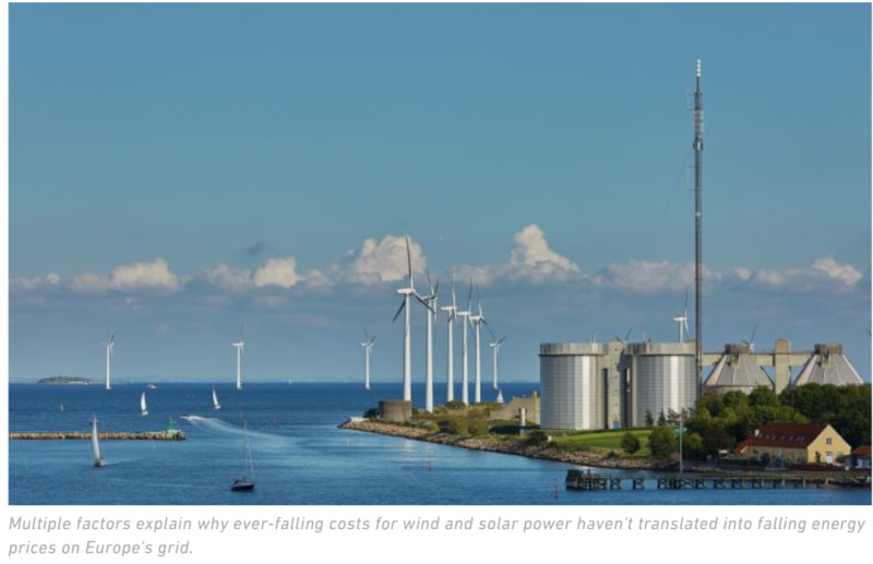 這里有幾個(gè)原因需要考慮。首先,可再生能源在整個(gè)歐洲發(fā)電量中所占的比例仍然相對(duì)較小。第二,最新的太陽能和風(fēng)能項(xiàng)目的LCOE下降幅度還沒有超過通過上網(wǎng)電價(jià)等支持機(jī)制補(bǔ)貼的既有的清潔能源電廠成本。另一種解釋是風(fēng)力發(fā)電廠和太陽能發(fā)電廠的可變產(chǎn)量必須通過礦物燃料發(fā)電機(jī)頻繁、快速的上下波動(dòng)來平衡,這增加了電力成本和碳排放的上升。但還有另一個(gè)更重要的因素需要考慮:雖然低成本的可再生能源抵消了電網(wǎng)的一部分需求,但仍需要化石燃料發(fā)電廠設(shè)定電力市場(chǎng)的邊際成本。