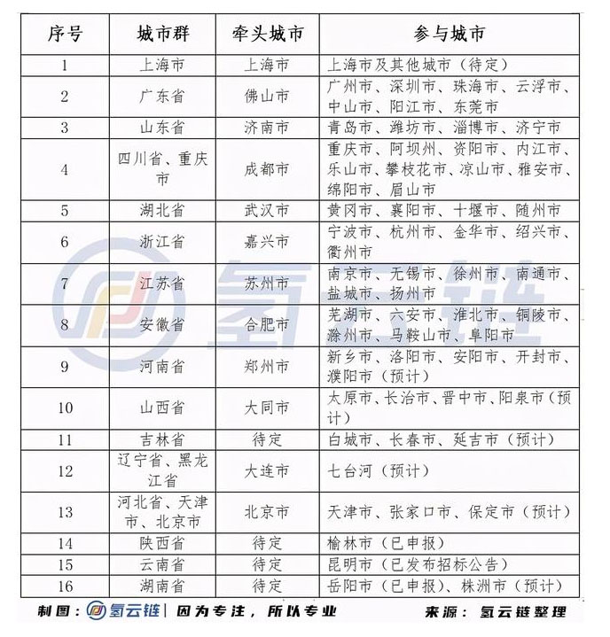 隨著截止日期的來臨,氫云鏈通過相關(guān)渠道咨詢與了解,掌握了全國各省、市燃料電池汽車示范城市群申報(bào)進(jìn)展工作的最新進(jìn)展,見表1: