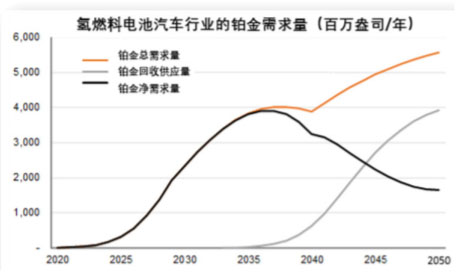 我們發(fā)現(xiàn)來自氫燃料電池汽車的鉑金總需求量會穩(wěn)步上升,到2050年將達(dá)到186噸(600萬盎司),但扣除回收供應(yīng)后的鉑金的凈需求在2038年就達(dá)到了124噸(400萬盎司)的峰值水平,之后凈需求量隨著鉑金回收供應(yīng)的增加而下降。在未來的30年時間里,來自所有終端應(yīng)用的鉑金需求量累計為8000噸(2.7億盎司)。其中,來自氫燃料電池汽車的鉑金總需求量為3000噸(或9400萬盎司),扣除回收供應(yīng)后的鉑金的凈需求量為2000噸(6500萬盎司)。在這個需求模型中,每年鉑金原礦的供應(yīng)增長率要逐漸增加到8%左右才能滿足氫燃料電池汽車行業(yè)的新增需求,但看起來這是一個可控的需求量。