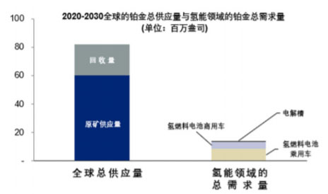 假設(shè)未來十年的開采量和回收量保持現(xiàn)有的水平,則2020至2030年期間鉑金的累計供應(yīng)量可達(dá)到2500噸,或8200萬盎司。此供應(yīng)量大約是上述來自電解水制氫和氫燃料電池汽車領(lǐng)域累計的鉑金需求量的6倍。