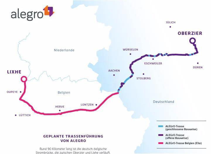 中國儲能網(wǎng)訊:德國和比利時輸電系統(tǒng)運營商Amprion和Elia Group宣布,德國和比利時電網(wǎng)之間首次實現(xiàn)直接連通。這條90公里長的地下直流電纜(Aachen Lüttich Electricity Grid Overlay ,ALEGrO)連接德國西部萊茵蘭地區(qū)和比利時南部瓦隆的變電站,投資成本5.5億歐元,可以輸送1000兆瓦的電力。該項目有助于將可再生能源納入電力系統(tǒng),為消費者提供廉價的電力,并加強兩國的電力供應(yīng)安全和亞琛-科隆地區(qū)的經(jīng)濟活力。