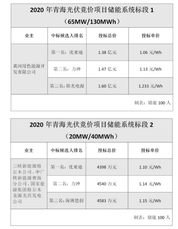 中國儲能網(wǎng)訊:11月16日,2020年青海光伏競價項目對儲能系統(tǒng)采購進行公示,其中比亞迪最低價中標,獨攬兩大標包,成為此次招標的最大贏家。兩標包中標候選人大致如下: