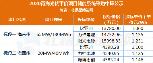 中國儲能網(wǎng)訊:11月16日,青海省2020年光伏競價(jià)項(xiàng)目儲能系統(tǒng)采購中標(biāo)公示,比亞迪奪得兩個標(biāo)段總計(jì)85MW/170MWh的儲能系統(tǒng),投標(biāo)總額合計(jì)近1.82億元,最低單價(jià)僅約1.06元/Wh。