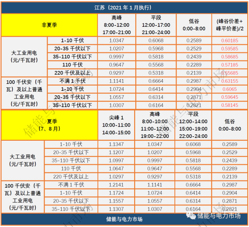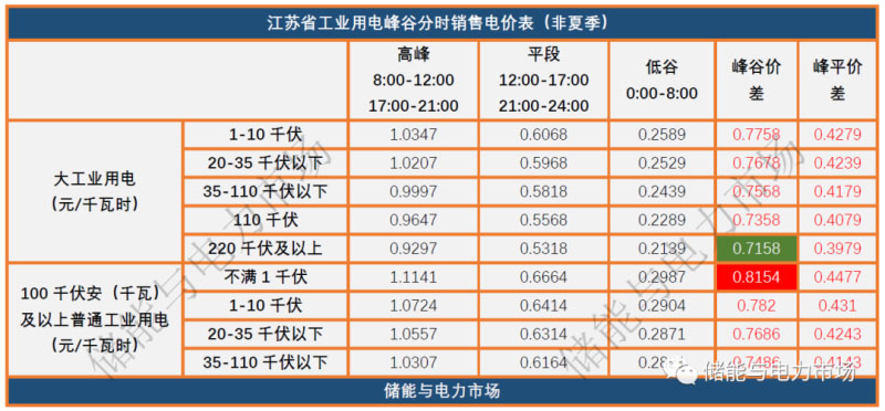 2020年11月3日,江蘇省發(fā)改委發(fā)布了《關于江蘇電網(wǎng)2020-2022年輸配電價和銷售電價有關事項的通知》。根據(jù)通知的內(nèi)容,江蘇省峰谷價差最大為0.8154,最低為0.7158(如下表)。