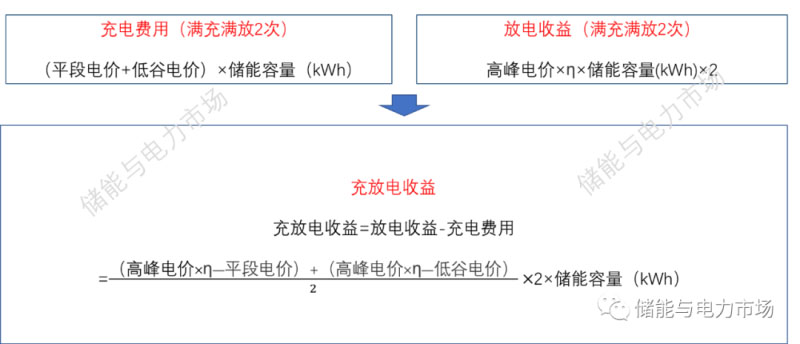假設每天兩充兩放,充放電效率為η,不考慮特殊情況下的尖峰電價,只考慮高峰、平段、低谷電價,充放電收益的計算可總結為下圖。