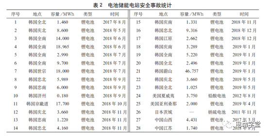 由表2可知,從火災(zāi)地點(diǎn)來(lái)看,電池儲(chǔ)能電站火災(zāi)事故主要集中在韓國(guó),而美國(guó)、日本和中國(guó)也均已發(fā)生電站火災(zāi)事故。從儲(chǔ)能類型來(lái)看,電池儲(chǔ)能技術(shù)類型主要為鋰電池。這一方面是由于鋰電池在各類型電池中裝機(jī)容量占比最大;另一方面,是因?yàn)殇囯姵貎?nèi)部存在較多放熱反應(yīng),在一定條件下易發(fā)生熱失控。